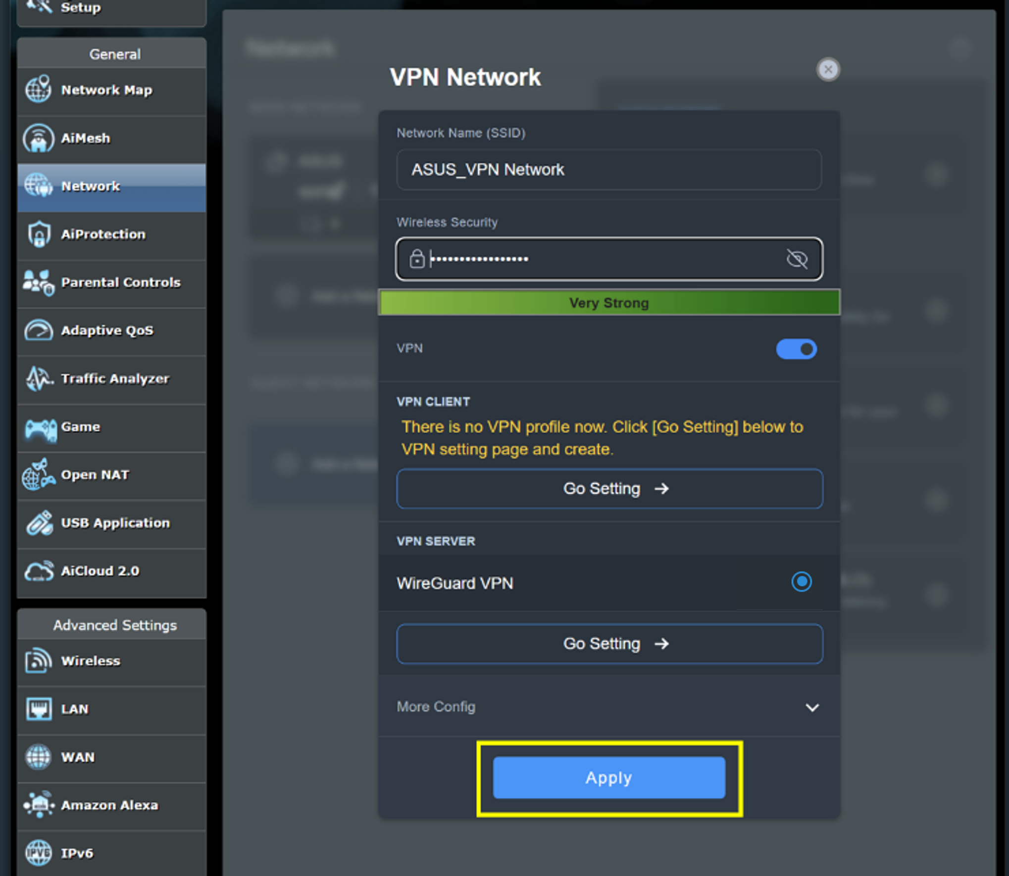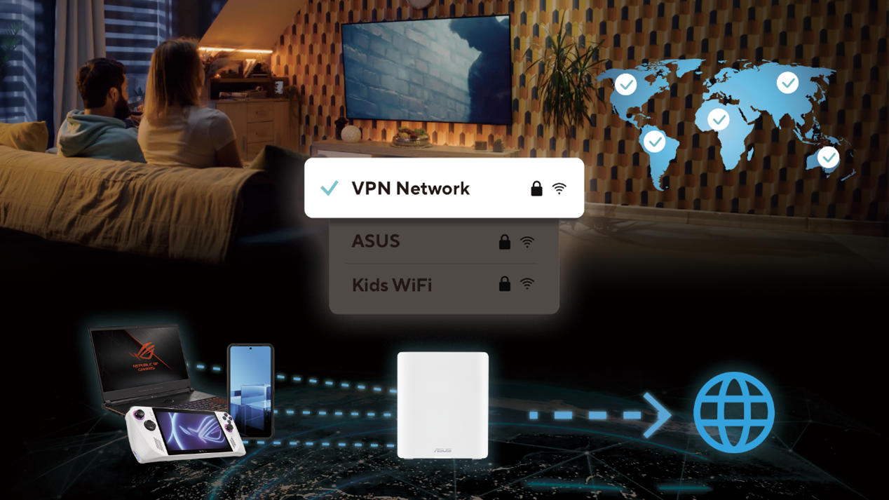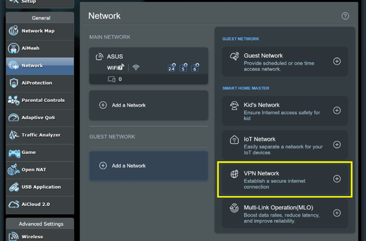 The VPN Network on ASUS routers provide a secure internet connection by routing traffic through a VPN, ensuring encrypted and safe data. Setting it up involves creating a dedicated SSID and configuring VPN settings using protocols like SurfsharkⓇ, NordVPNⓇ, CyberGhostⓇ, or WireGuardⓇ etc. ASUS routers support popular VPN services, making setup easy. Devices connected to the VPN Network automatically route their traffic through the VPN, simplifying security. It also supports scheduling and bandwidth management to optimize network performance and security, especially for devices that don't easily support VPNs, such as smart TVs and gaming consoles.